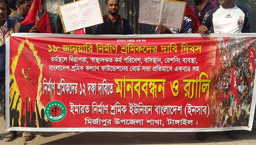 টাঙ্গাইলের মির্জাপুরে ইমারত নির্মাণ শ্রমিকদের ১২ দফা দাবিতে মানববন্ধন ও র‍্যালি অনুষ্ঠিত হয়েছে। ১৮ জানুয়ারী ২০২৬ রবিবার সকালে ইমারত নির্মাণ শ্রমিক ইউনিয়ন বাংলাদেশ মির্জাপুর উপজেলা শাখার উদ্যোগে এ কর্মসূচি পালন করা হয়।