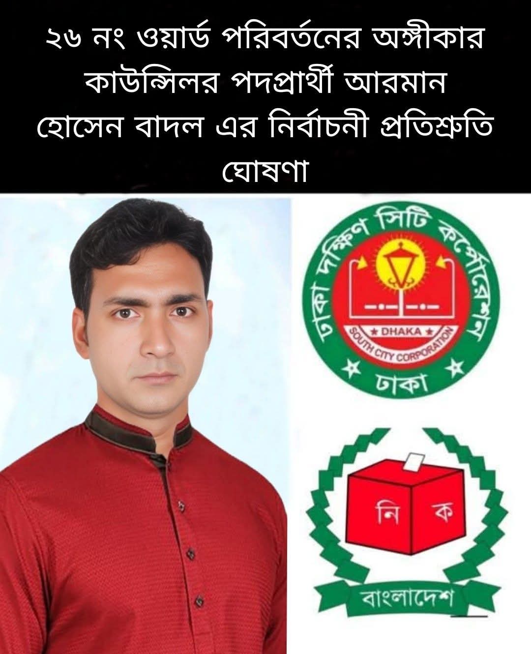 ২৬ নং ওয়ার্ড কাউন্সিলর পদপ্রার্থী আরমান হোসেন বাদলের নির্বাচনী অঙ্গীকার ঘোষণা