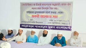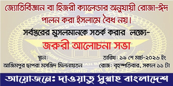 অদ্য বৃহস্পতিবার ১৯ শে মার্চ সকাল ১১ টায় দাওয়াতুস সুন্নাহ বাংলাদেশের উদ্যোগে পুরাতন ঢাকার ঐতিহ্যবাহী আজিমপুর ছাপড়া জামে মসজিদ মিলনায়তনে রোজা ঈদ পালনের ক্ষেত্রে জ্যোতির্বিজ্ঞান বা হিজরী ক্যালেন্ডার নয়; বরং চাঁদ দেখে রোজা ঈদ পালন করার বিষয়ে সর্বস্তরের মুসলমানদেরকে সতর্ক করার জন্য জরুরী আলোচনা সভা অনুষ্ঠিত হয়েছে।