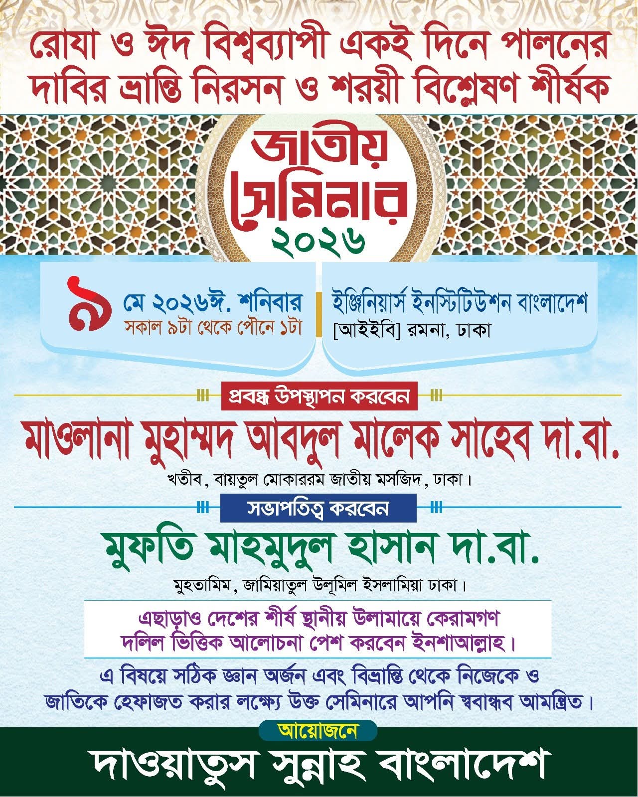 মুহতারাম! আপনি অবগত আছেন, রোজা-ঈদ পালনের বিষয়ে আমাদের দেশে এক ধরনের বিভ্রান্তি ও ফিতনা ছড়িয়ে পড়েছে। এ থেকে সাধারণ মুসলমানদেরকে বাঁচাতে ও সতর্ক করতে আল্লাহর রহমতে আগামী ৯ই মে ২০২৬ শনিবার সকাল ৯ টা থেকে দুপুর পৌনে ১টা পর্যন্ত ইঞ্জিনিয়ার্স ইনস্টিটিউশন বাংলাদেশ( IEB) রমনা, ঢাকায় “রোজা ও ঈদ বিশ্বব্যাপী একই দিনে পালনের দাবির ভ্রান্তি নিরসন ও শরয়ী বিশ্লেষণ শীর্ষক জাতীয় সেমিনার” এর আয়োজন করা হয়েছে।